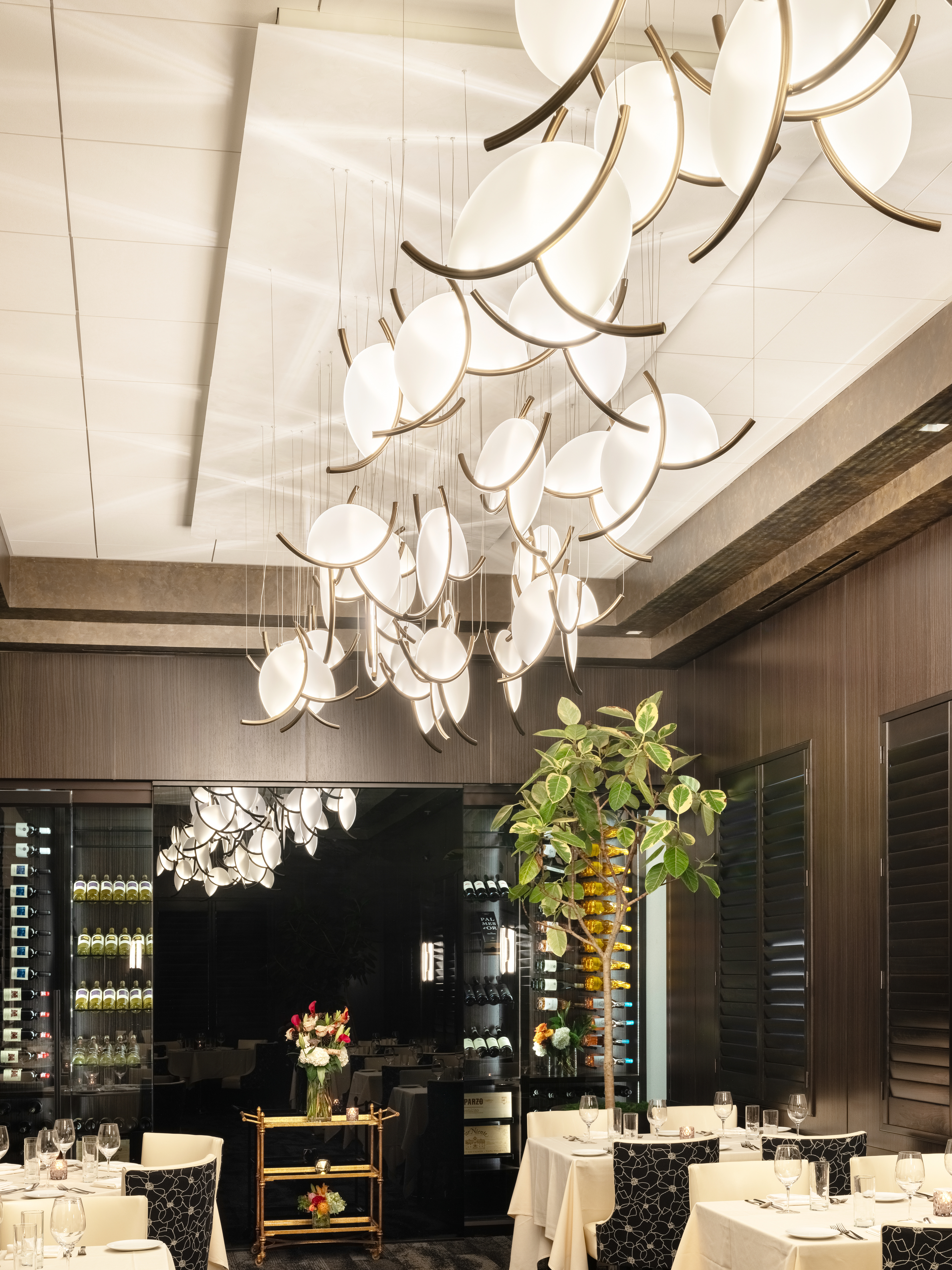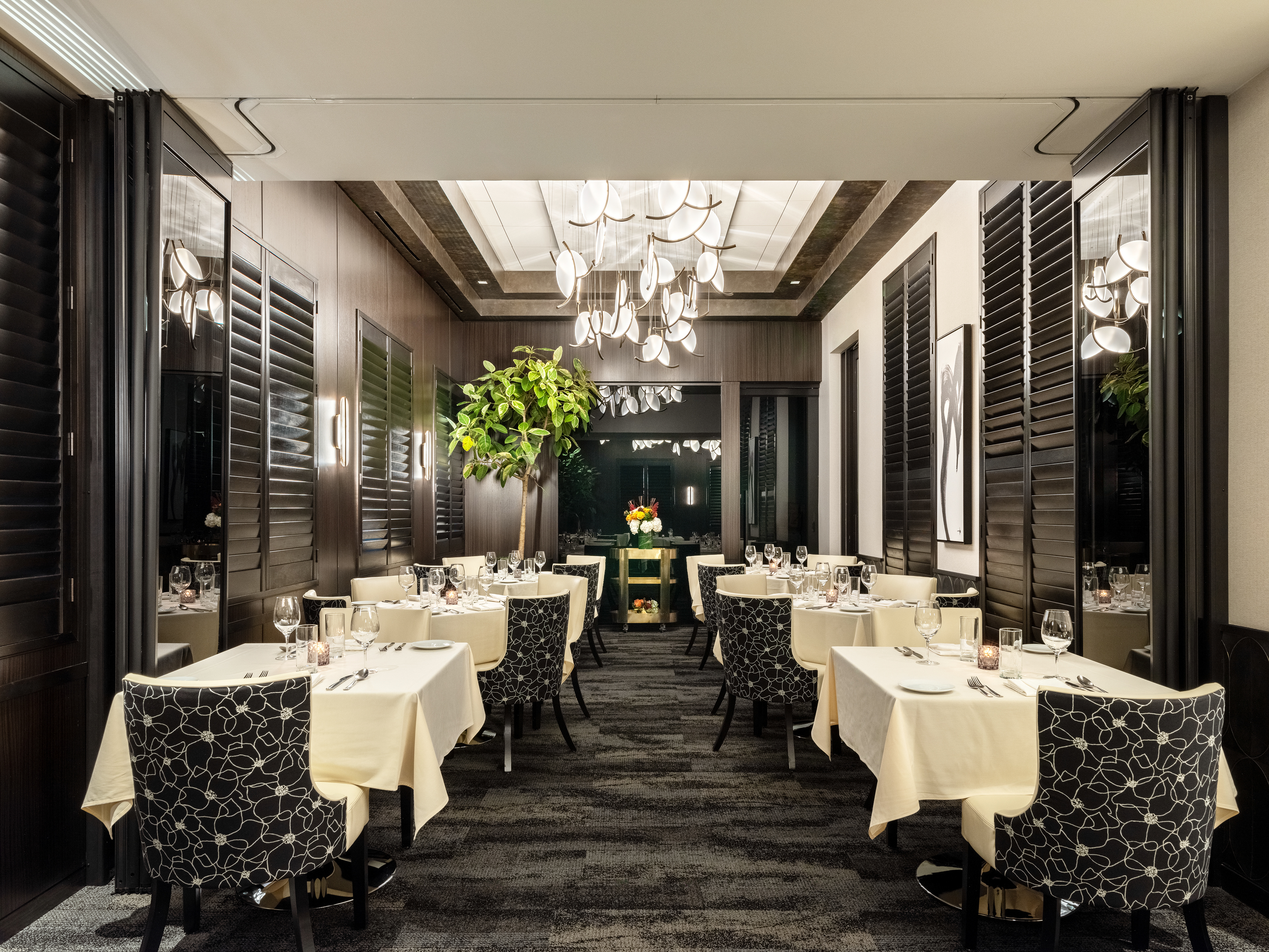 The transformation of Potente’s private dining room embodied moody elegance, seamlessly blending with the restaurant’s ambiance. Flexibility of the space was a key component for the renovation. Whether planning a cocktail party or a dinner for eight, the room can easily transform from a dining room into two separate partitioned rooms.