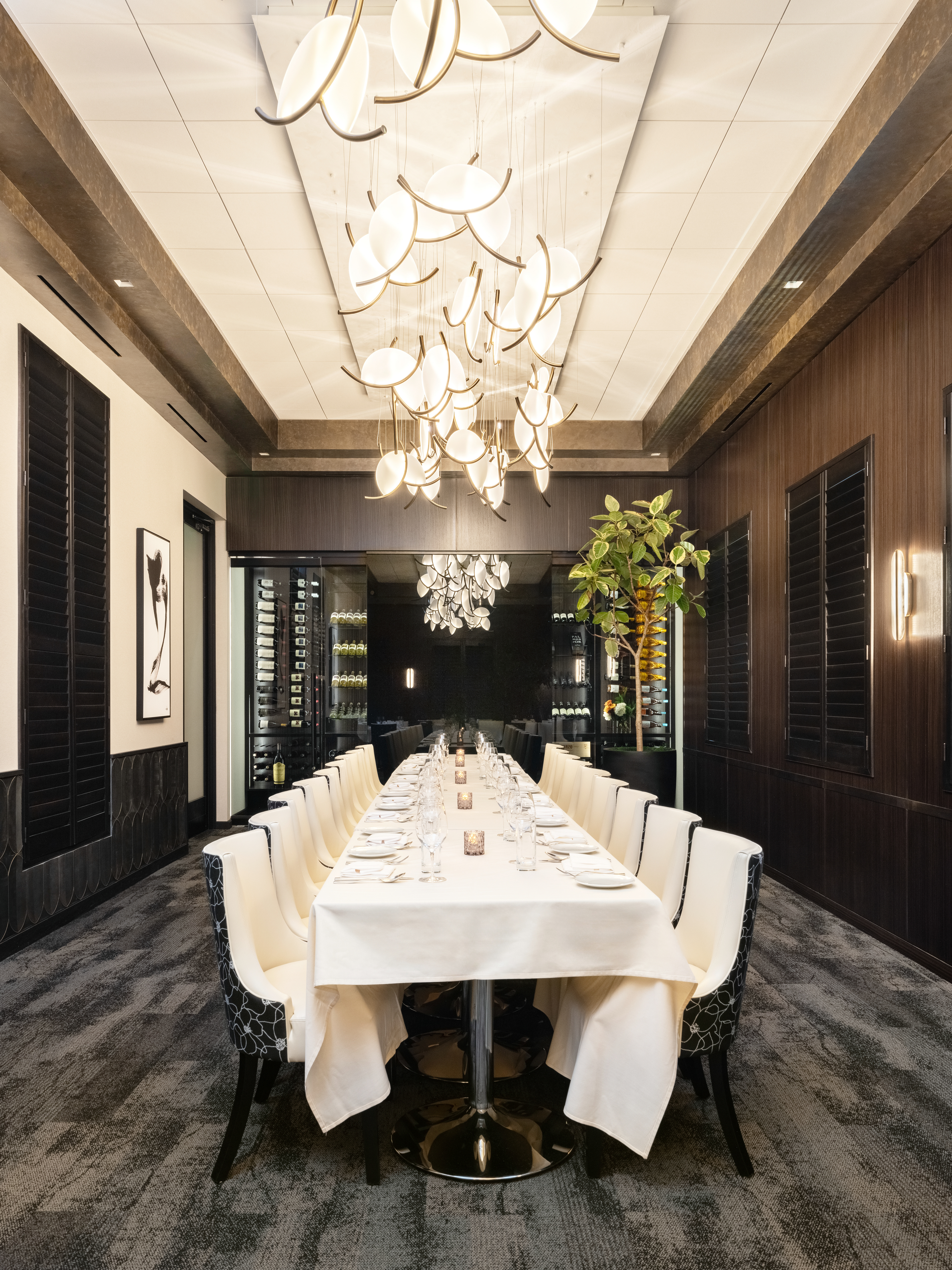 The versatility of the space promises an immersive experience that transcends aesthetics. Focal design features include a floor-to-ceiling glass wine room and iconic Yellow Goat Design chandeliers, the latter of which casts an interplay of shadows that add depth and dimension to the space. The custom upholstery harmonizes seamlessly with the room’s ambiance. The multi-functional room is a canvas for engaging presentations, immersive entertainment, and shared experiences.